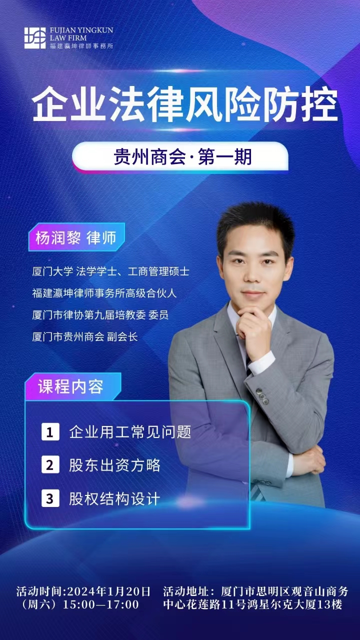 商会特别邀请法律顾问杨润黎副会长为商会企业讲解企业用工等法律问题,2024年1月20日(周六)15:00-17:00在厦门市思明区观音山商务中心花莲路11号鸿星尔克大厦13楼,欢迎各位会员朋友们积极报名参加